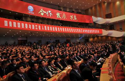 趙洪祝在致辭時表示,與中央企業(yè)對接合作,是浙江經濟社會發(fā)展的戰(zhàn)略選擇和重大機遇,有利于浙江全面貫徹落實科學發(fā)展觀,繼續(xù)保持經濟平穩(wěn)較快增長;有利于加快大平臺大產業(yè)大項目大企業(yè)建設,促進產業(yè)結構調整和經濟轉型升級;有利于促進國有資本和民間資本優(yōu)勢互補、相得益彰、共同發(fā)展,提升浙江經濟的整體素質,推動浙江經濟社會發(fā)展邁上新臺階。當前和今后一個時期,浙江將繼續(xù)實施“八八戰(zhàn)略”和“創(chuàng)業(yè)富民、創(chuàng)新強省”總戰(zhàn)略,加快推進“三大國家戰(zhàn)略”等重大戰(zhàn)略舉措。這不僅是浙江未來發(fā)展新的增長極,也是浙江與中央企業(yè)合作的新空間。真誠歡迎中央企業(yè)來浙投資建設,努力實現互利共贏、共同發(fā)展。浙江將把深化與中央企業(yè)的戰(zhàn)略合作擺到更重要的位置,全力保障和服務好中央企業(yè)在浙江的投資項目。