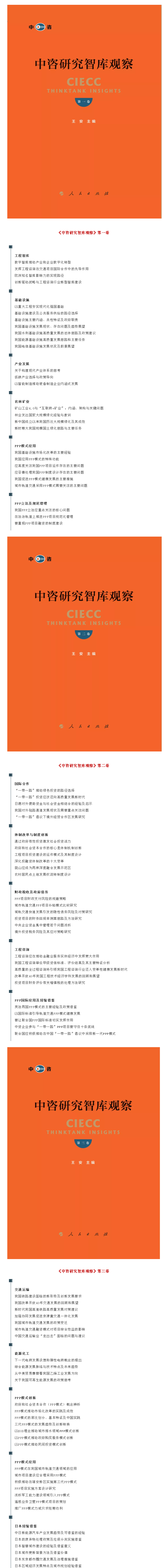 《左傳》云:太上有立德,其次有立功,其次有立言。雖久不廢,此之謂不朽。 《史記》曰:究天人之際,通古今之變,成一家之言。 《中咨研究智庫(kù)觀察》:2020年初,人民出版社出版發(fā)行! 作為中國(guó)規(guī)模最大的綜合性咨詢(xún)機(jī)構(gòu)和以工程咨詢(xún)?yōu)橹鳂I(yè)的公益類(lèi)中央企業(yè),中國(guó)國(guó)際工程咨詢(xún)有限公司(簡(jiǎn)稱(chēng)中咨公司)自誕生之日起,就肩負(fù)著“服務(wù)國(guó)家 貢獻(xiàn)社會(huì)”的使命。近40年來(lái),黨和國(guó)家領(lǐng)導(dǎo)人歷來(lái)十分關(guān)懷中咨公司的發(fā)展和貢獻(xiàn)。宋平同志為中咨公司確立了“公正、科學(xué)、可靠”的服務(wù)宗旨,明確提出“中咨公司不同于一般的公司,它不是以盈利為目的的經(jīng)營(yíng)性公司,它的基本宗旨是代表國(guó)家利益,對(duì)國(guó)家負(fù)責(zé)”。朱镕基同志以“敢言、多謀、慎斷”六字箴言為中咨公司確定了行為準(zhǔn)則,殷切希望“把中咨公司建設(shè)成為誠(chéng)信為本,優(yōu)質(zhì)高效,在國(guó)內(nèi)有權(quán)威,在國(guó)際上有影響的工程咨詢(xún)機(jī)構(gòu)”。 進(jìn)入新時(shí)代,黨中央、國(guó)務(wù)院更加重視中咨公司在國(guó)家經(jīng)濟(jì)建設(shè)和國(guó)防建設(shè)中的智庫(kù)參謀作用。習(xí)近平、李克強(qiáng)等中央領(lǐng)導(dǎo)同志多次在中咨公司有關(guān)報(bào)告上作出重要批示,充分肯定中咨公司在咨詢(xún)?cè)u(píng)估及智庫(kù)研究工作中的一系列重要建議。 高端智庫(kù)是國(guó)家軟實(shí)力的重要載體,承擔(dān)著推進(jìn)國(guó)家治理體系和治理能力現(xiàn)代化的歷史重任。2015年1月,國(guó)務(wù)院出臺(tái)《關(guān)于加強(qiáng)中國(guó)特色新型智庫(kù)建設(shè)的意見(jiàn)》,明確了新時(shí)期智庫(kù)建設(shè)的總體目標(biāo)和發(fā)展布局。中咨公司始終堅(jiān)持“不忘初心、牢記使命”,不斷開(kāi)拓創(chuàng)新、銳意進(jìn)取、把握規(guī)律,按照“12445”戰(zhàn)略構(gòu)想,努力將公司建設(shè)成為國(guó)內(nèi)有權(quán)威、國(guó)際有影響的中國(guó)特色新型高端智庫(kù),為更好地服務(wù)于國(guó)家經(jīng)濟(jì)建設(shè)和社會(huì)發(fā)展而努力奮斗。 中咨公司向來(lái)注重知識(shí)資產(chǎn)的創(chuàng)造和積累,也非常重視智庫(kù)成果的傳播工作。除向中央報(bào)送咨詢(xún)專(zhuān)報(bào)外,中咨公司鼓勵(lì)智庫(kù)專(zhuān)家接受專(zhuān)業(yè)媒體采訪,在重要論壇發(fā)表演講,發(fā)揮智庫(kù)成果的社會(huì)影響力。為探索中咨公司智庫(kù)成果傳播新渠道,加強(qiáng)高端智庫(kù)網(wǎng)絡(luò)建設(shè)和知識(shí)管理,2018年1月中咨公司開(kāi)通了“中咨研究”微信公眾號(hào),由研究中心負(fù)責(zé)運(yùn)營(yíng)維護(hù)。通過(guò)新媒體平臺(tái)發(fā)表中咨公司本部及所屬企業(yè)職工,以及公司離退休老專(zhuān)家的專(zhuān)業(yè)文章,旨在傳播中咨公司咨詢(xún)研究最新成果,促進(jìn)行業(yè)信息交流,提升中咨公司智庫(kù)建設(shè)及專(zhuān)業(yè)研究的社會(huì)影響力。 為更好地發(fā)揮中咨研究智庫(kù)成果的社會(huì)價(jià)值,研究中心對(duì)在“中咨研究”微信公眾號(hào)公開(kāi)發(fā)表的專(zhuān)業(yè)研究文章,精選編輯《中咨研究智庫(kù)觀察》叢書(shū),作為“中咨研究系列叢書(shū)”的一個(gè)系列,由人民出版社公開(kāi)出版發(fā)行。 人民出版社是中共中央宣傳部直屬的出版黨和國(guó)家重要文件的中央級(jí)權(quán)威出版機(jī)構(gòu),是中宣部直屬事業(yè)單位?!吨凶裳芯恐菐?kù)觀察》系列叢書(shū)由人民出版社公開(kāi)出版發(fā)行,將進(jìn)一步推動(dòng)中咨公司智庫(kù)成果的社會(huì)傳播。 《中咨研究智庫(kù)觀察》第一批圖書(shū)(1-3卷)于2020年初由人民出版社正式出版發(fā)行,收錄了2018年1月至2019年10月在“中咨研究”公眾號(hào)刊發(fā)的85篇精選文章,內(nèi)容涵蓋工程咨詢(xún)、工程智庫(kù)、基礎(chǔ)設(shè)施、產(chǎn)業(yè)發(fā)展、農(nóng)林礦業(yè)、能源化工、PPP模式,投融資體制改革、財(cái)政稅收與政府債務(wù)、國(guó)際合作、日本經(jīng)驗(yàn)借鑒等領(lǐng)域。 藏諸名山,傳之其人。中咨公司擬將《中咨研究智庫(kù)觀察》品牌工程持續(xù)推進(jìn)下去,研究中心目前正積極開(kāi)展《中咨研究智庫(kù)觀察》第二批圖書(shū)的文章征集刊發(fā)等相關(guān)工作,希望社會(huì)各界更加關(guān)注“中咨研究”微信公眾號(hào),同時(shí)希望中咨公司本部及所屬企業(yè)員工及離退休老專(zhuān)家,繼續(xù)為“中咨研究”微信公眾號(hào)積極撰寫(xiě)高質(zhì)量文稿,以便納入《中咨研究智庫(kù)觀察》叢書(shū)公開(kāi)出版發(fā)行,為中咨公司高端智庫(kù)建設(shè)不斷添磚加瓦。