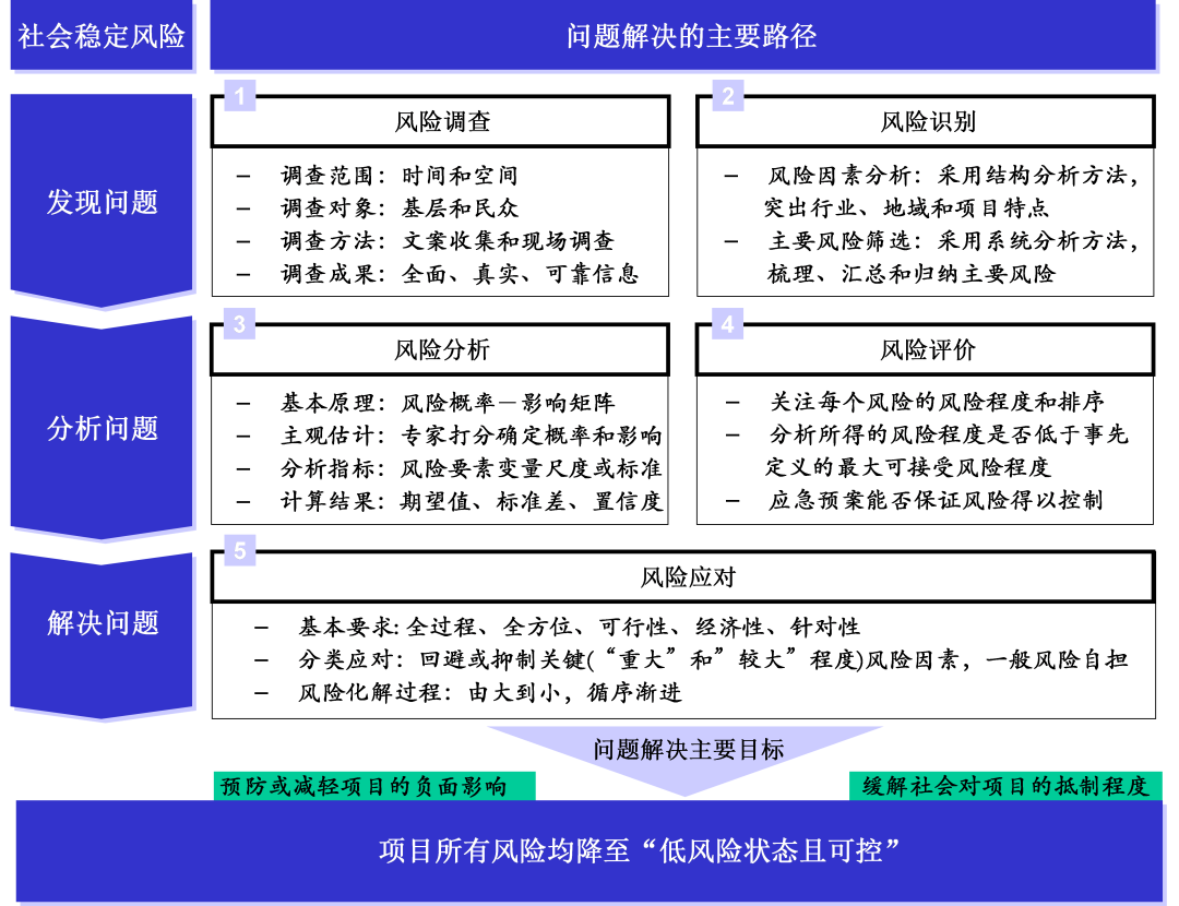重大項(xiàng)目社會(huì)穩(wěn)定風(fēng)險(xiǎn)評(píng)估方法研究 ——“以問(wèn)題解決為導(dǎo)向”的項(xiàng)目穩(wěn)評(píng)框架的提出 李開(kāi)孟 徐成彬 彭振武 摘要:本文從社會(huì)穩(wěn)定風(fēng)險(xiǎn)及其評(píng)估的基本概念出發(fā),綜述了國(guó)內(nèi)外有關(guān)社會(huì)穩(wěn)定風(fēng)險(xiǎn)研究的理論方法和實(shí)踐探索,針對(duì)“以整體風(fēng)險(xiǎn)等級(jí)為導(dǎo)向”的穩(wěn)評(píng)框架在評(píng)估方法上存在的缺陷和不足,提出以“發(fā)現(xiàn)問(wèn)題—分析問(wèn)題—解決問(wèn)題”為主線的項(xiàng)目社會(huì)穩(wěn)定風(fēng)險(xiǎn)評(píng)估新框架?!耙詥?wèn)題解決為導(dǎo)向”的新框架思路是:通過(guò)全面深入調(diào)查,在分析各風(fēng)險(xiǎn)因素的基礎(chǔ)上確定影響社會(huì)穩(wěn)定的主要風(fēng)險(xiǎn),分析各風(fēng)險(xiǎn)的發(fā)生概率和影響程度,對(duì)標(biāo)評(píng)判風(fēng)險(xiǎn)程度及可控程度,對(duì)不可接受的風(fēng)險(xiǎn)制定切實(shí)可行的應(yīng)對(duì)措施,所有風(fēng)險(xiǎn)都處于“低風(fēng)險(xiǎn)且可控”狀態(tài)才可得出項(xiàng)目社會(huì)穩(wěn)定風(fēng)險(xiǎn)可接受的評(píng)估結(jié)論。針對(duì)“以問(wèn)題解決為導(dǎo)向”穩(wěn)評(píng)方法應(yīng)用,建議全面深入調(diào)查發(fā)現(xiàn)項(xiàng)目社會(huì)穩(wěn)定風(fēng)險(xiǎn)問(wèn)題,通過(guò)結(jié)構(gòu)分解與系統(tǒng)集成進(jìn)行風(fēng)險(xiǎn)識(shí)別,基于概率—影響矩陣的項(xiàng)目風(fēng)險(xiǎn)分析,對(duì)標(biāo)評(píng)判風(fēng)險(xiǎn)水平及其可控程度,分類(lèi)制定切實(shí)可行的風(fēng)險(xiǎn)應(yīng)對(duì)措施。 關(guān)鍵詞:重大項(xiàng)目;社會(huì)穩(wěn)定風(fēng)險(xiǎn);評(píng)估方法;以問(wèn)題解決為導(dǎo)向 一、風(fēng)險(xiǎn)社會(huì)與社會(huì)穩(wěn)定風(fēng)險(xiǎn)的產(chǎn)生 經(jīng)過(guò)四十多年的改革開(kāi)放,我國(guó)經(jīng)濟(jì)社會(huì)發(fā)展成就舉世矚目。在經(jīng)濟(jì)發(fā)展水平顯著提升的同時(shí),社會(huì)問(wèn)題開(kāi)始逐步凸顯,這是社會(huì)發(fā)展的歷史階段所決定的??v觀西方工業(yè)化國(guó)家的發(fā)展歷程,都曾經(jīng)歷過(guò)類(lèi)似階段,而且在一些國(guó)家的表現(xiàn)更為嚴(yán)峻和激烈,如英國(guó)工業(yè)化過(guò)程中的圈地運(yùn)動(dòng)。許多西方學(xué)者認(rèn)為,進(jìn)入現(xiàn)代化的一定階段后,必然伴隨社會(huì)風(fēng)險(xiǎn)的增長(zhǎng),并進(jìn)入風(fēng)險(xiǎn)社會(huì)的發(fā)展階段,社會(huì)風(fēng)險(xiǎn)是社會(huì)現(xiàn)代性的基本要素。 20世紀(jì)后半期,社會(huì)風(fēng)險(xiǎn)逐漸被社會(huì)學(xué)界所關(guān)注,西方許多著名社會(huì)學(xué)家如烏爾里?!へ惪耍║lrich Beck)、安東尼·吉登斯(Anthony Giddens)、尼克拉斯·盧曼(Von Niklas Luhmann)等都對(duì)社會(huì)風(fēng)險(xiǎn)進(jìn)行過(guò)深入研究,形成了有關(guān)風(fēng)險(xiǎn)的社會(huì)學(xué)理論。其基本假設(shè)是:人類(lèi)正從一個(gè)現(xiàn)代化的社會(huì)進(jìn)入一個(gè)新型的風(fēng)險(xiǎn)社會(huì)?,F(xiàn)代化的科學(xué)技術(shù)發(fā)展和工業(yè)化推動(dòng),使人類(lèi)進(jìn)入一個(gè)它過(guò)去所陌生的世界;現(xiàn)代化邏輯本身所產(chǎn)生的新的社會(huì)風(fēng)險(xiǎn),完全不同于傳統(tǒng)的社會(huì)問(wèn)題、社會(huì)矛盾和社會(huì)沖突。過(guò)去的生活經(jīng)驗(yàn)、技術(shù)手段和組織制度,已不足以使人類(lèi)防止、規(guī)避和應(yīng)對(duì)新的社會(huì)風(fēng)險(xiǎn)的威脅。進(jìn)入風(fēng)險(xiǎn)社會(huì),是社會(huì)發(fā)展的現(xiàn)代化水平達(dá)到一定階段的產(chǎn)物。德國(guó)社會(huì)學(xué)家烏爾里?!へ惪苏J(rèn)為,現(xiàn)代性正從古典工業(yè)社會(huì)的輪廓中脫穎而出,正在形成一種嶄新的形式—工業(yè)化時(shí)代的“風(fēng)險(xiǎn)社會(huì)”。英國(guó)社會(huì)學(xué)家安東尼·吉登斯認(rèn)為,風(fēng)險(xiǎn)概念標(biāo)識(shí)了現(xiàn)代社會(huì)與前現(xiàn)代社會(huì)的根本差異。在自然和傳統(tǒng)消亡后生存的世界,其特點(diǎn)是從“外部風(fēng)險(xiǎn)”逐漸向“人造風(fēng)險(xiǎn)”轉(zhuǎn)移。 我國(guó)社會(huì)學(xué)者也認(rèn)為,隨著社會(huì)的發(fā)展,過(guò)去對(duì)社會(huì)安全問(wèn)題的認(rèn)識(shí)有了新的變化,現(xiàn)代社會(huì)開(kāi)始出現(xiàn)一種新型的社會(huì)穩(wěn)定風(fēng)險(xiǎn)。關(guān)于傳統(tǒng)社會(huì)安全,從政法工作角度分析可以歸為六種:一是“三股勢(shì)力”,暴力恐怖、宗教極端、民族分裂勢(shì)力;二是社會(huì)黑暗勢(shì)力(即黑社會(huì));三是危害社會(huì)治安的刑事慣犯;四是販毒集團(tuán);五是邪教骨干;六是各種敵對(duì)性質(zhì)的非法社團(tuán)問(wèn)題。在傳統(tǒng)的社會(huì)安全領(lǐng)域,這六個(gè)方面一直是人們關(guān)注的焦點(diǎn)。但是,隨著群體性事件的逐步增多,人們逐漸開(kāi)始意識(shí)到現(xiàn)代社會(huì)出現(xiàn)了一些新型的社會(huì)穩(wěn)定風(fēng)險(xiǎn),這些風(fēng)險(xiǎn)廣泛存在于工程建設(shè)、金融活