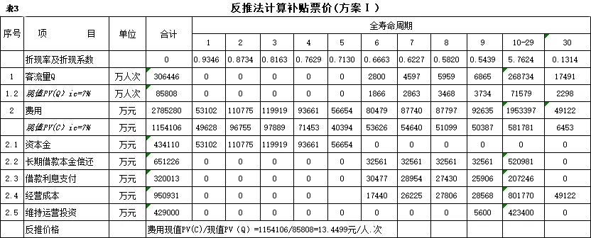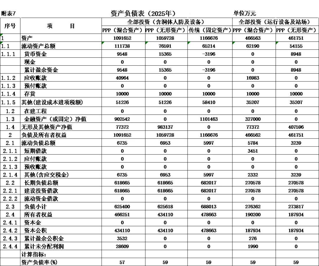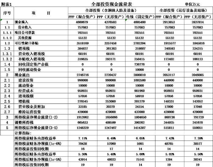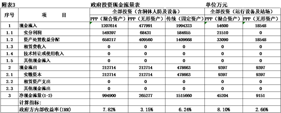式中,Ct為項(xiàng)目包括投資在內(nèi)的各期費(fèi)用,一般為財(cái)務(wù)分析的投資、經(jīng)營(yíng)成本估算及維持運(yùn)營(yíng)投資,Qt為第t期的產(chǎn)出供應(yīng)消費(fèi)的量,i0為折現(xiàn)率。 2.反推價(jià)格中費(fèi)用取值 反推價(jià)格公式中的費(fèi)用可以利用全部投資現(xiàn)金流量表或資本金現(xiàn)金流量表中的現(xiàn)金流出量。本文推薦在PPP項(xiàng)目中,采用資本金現(xiàn)金流量表中的現(xiàn)金流出計(jì)算反推價(jià)格,原因是資本金財(cái)務(wù)基準(zhǔn)收益率是投資者期望的目標(biāo)收益率,采用資本金現(xiàn)金流出量反推的價(jià)格,計(jì)算的補(bǔ)貼額可直接達(dá)到投資者期望的收益目標(biāo),同時(shí)也可滿(mǎn)足全部投資所得稅后財(cái)務(wù)內(nèi)部收益率指標(biāo)。 3.反推價(jià)格折現(xiàn)率取值 反推價(jià)格折現(xiàn)率取值可以適當(dāng)取值偏高一些,需要反復(fù)試算,選取合理折現(xiàn)率。 方案Ⅰ反推價(jià)格選取按折現(xiàn)率7%,計(jì)算結(jié)果,反推價(jià)格為13.4499元/人次,計(jì)算過(guò)程見(jiàn)表3。 4.可行性缺口補(bǔ)助計(jì)算過(guò)程 (1)反推價(jià)格(P=13.4499元/人.次); (2)利用反推價(jià)格和可研報(bào)告的產(chǎn)品(或服務(wù))數(shù)量計(jì)算達(dá)到目標(biāo)收益率的收入總量,見(jiàn)表3序號(hào)2,計(jì)算票款收入41.22億元(該項(xiàng)收入為原運(yùn)營(yíng)收入和需要補(bǔ)貼收入之和); (3)目標(biāo)收入總量減去原票款收入,計(jì)算需要補(bǔ)貼數(shù)額,見(jiàn)表3序號(hào)3,計(jì)算補(bǔ)貼收入(補(bǔ)貼票款收入與原票款收入之差(2.1-1.1))34.19億元; (4)計(jì)算金融資產(chǎn)保底收入與利息收入之和,見(jiàn)表3序號(hào)4(4.1+4.1)232.39億元; (5)調(diào)整補(bǔ)貼收入,當(dāng)有些年序中補(bǔ)貼票款收入與原票款收入之差小于零時(shí),需要調(diào)整補(bǔ)貼收入,令其補(bǔ)貼收入等于當(dāng)年的金融資產(chǎn)保底收入與利息收入之和,見(jiàn)表3序號(hào)5,9.9億元; (6)補(bǔ)貼收入,見(jiàn)表3序號(hào)6,351.82億元。 (三)財(cái)務(wù)分析指標(biāo)匯總 各方案可行性缺口補(bǔ)貼及評(píng)價(jià)指標(biāo)匯總見(jiàn)表5。 (四)政府收支現(xiàn)金流量分析 政府收支現(xiàn)金流量表見(jiàn)表6。 (五)五方案數(shù)據(jù)對(duì)比分析的兩點(diǎn)啟示 數(shù)據(jù)對(duì)比分析結(jié)果的啟示: 啟示一:采用PPP模式要合理界定項(xiàng)目的范圍?;A(chǔ)設(shè)施項(xiàng)目投資結(jié)構(gòu)中純公益性設(shè)施投資占有較大比重的項(xiàng)目不適宜將全部投資納入PPP模式,建議將純公益性設(shè)施與運(yùn)營(yíng)設(shè)施分開(kāi)處理,兩部分投資可選擇不同的運(yùn)作模式。 第一組案例,PPP模式方案Ⅰ和方案Ⅱ與政府自建的傳統(tǒng)模式方案Ⅲ相比: 方案Ⅰ和方案Ⅱ根據(jù)特許經(jīng)營(yíng)協(xié)議規(guī)定的績(jī)效考核標(biāo)準(zhǔn),兩方案投資、經(jīng)營(yíng)成本及更新改造投資均比傳統(tǒng)模式政府自建成本節(jié)約10%左右。表5財(cái)務(wù)指標(biāo)計(jì)算結(jié)果可行性缺口補(bǔ)貼,方案Ⅰ為351.82億元,方案Ⅱ?yàn)?25.75萬(wàn)元,方案Ⅲ為278.24億元。方案Ⅲ比方案Ⅰ節(jié)約73.43億元,比方案Ⅱ節(jié)約47.51億元。表6政府現(xiàn)金收支流量分析結(jié)果,方案Ⅲ政府收支凈現(xiàn)值(ic=5%)為最小-23.69億元,比方案Ⅰ-35.71億元,減少12.02億元, 比方案Ⅱ-58.64億元,減少34.95億元。 為什么傳統(tǒng)模式方案Ⅲ在投資規(guī)模、經(jīng)營(yíng)成本、更新改造投資均高出兩方案10%左右的情況下,而財(cái)務(wù)指標(biāo)優(yōu)于PPP模式?主要原因有兩個(gè): 一是,地鐵項(xiàng)目投資結(jié)構(gòu)分為兩部分,洞體工程為地鐵運(yùn)營(yíng)提供了運(yùn)輸空間,屬于純公益性質(zhì),且投資占比在60%左右,而投資占比40%左右的營(yíng)運(yùn)設(shè)施,則屬于經(jīng)營(yíng)性。在傳統(tǒng)項(xiàng)目實(shí)施方案中洞體及人防土建工程按80-100年提取折舊,在25年內(nèi)固定資產(chǎn)提取折舊57.89億元,回收固定資產(chǎn)余值54.93億元。而選擇PPP模式時(shí),洞體及人防建設(shè)成本在25年項(xiàng)目公司全部回收,顯然運(yùn)營(yíng)期增加了政府補(bǔ)貼額。 二是,政府自建模式方案Ⅲ,不存在對(duì)社會(huì)資本補(bǔ)貼收益的支出。政府自建模式的缺點(diǎn)是初始投資大,建設(shè)及運(yùn)營(yíng)風(fēng)險(xiǎn)全部由政府承擔(dān)。 啟示二:確認(rèn)PPP模式資產(chǎn)性質(zhì)、設(shè)置保底量及合理分擔(dān)政府與社會(huì)投資人的風(fēng)險(xiǎn),直接影響可行性缺口補(bǔ)貼的計(jì)算結(jié)果。 第一組案例是全部投資(含洞體及人防工程投資)條件下的PPP模式,方案Ⅰ為混合資產(chǎn),方案Ⅱ?yàn)闊o(wú)形資產(chǎn)(不再詳述)。 第二組案例扣除洞體及人防工程投資,方案Ⅳ混合資產(chǎn),方案Ⅴ無(wú)形資產(chǎn)。以下本文重點(diǎn)分析第二組方案PPP模式方案Ⅳ混合資產(chǎn)定性的過(guò)程。 方案Ⅳ和方案Ⅴ是扣除洞體及人防土建工程投資的PPP項(xiàng)目,項(xiàng)目總投資42.46億元,資本金18.79億元,政府出資5%,為0.93億元,社會(huì)出資人出資95%,為17.85億元。方案Ⅳ資產(chǎn)性質(zhì)為混合資產(chǎn),方案Ⅴ資產(chǎn)性質(zhì)為無(wú)