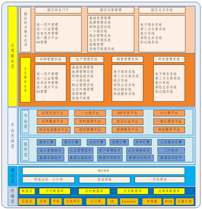 面向新材料產(chǎn)業(yè)園的智慧管理系統(tǒng)研究 王瑞江 朱曉霞 張莉莉 夏艷麗 摘要: 產(chǎn)業(yè)園區(qū)是區(qū)域經(jīng)濟(jì)發(fā)展、城市可持續(xù)健康發(fā)展、產(chǎn)業(yè)轉(zhuǎn)型升級(jí)的重要集聚區(qū)。而園區(qū)信息化建設(shè)是產(chǎn)業(yè)園發(fā)展的重要支撐部分,又是區(qū)域經(jīng)濟(jì)發(fā)展、城市建設(shè)發(fā)展的新主題與新動(dòng)力,創(chuàng)建以智能技術(shù)為支撐的生態(tài)、高效的智慧園區(qū)是未來的趨勢(shì)。本文就以新材料產(chǎn)業(yè)園規(guī)劃建設(shè)為基礎(chǔ),明確其建設(shè)目標(biāo)和需求,提出新材料產(chǎn)業(yè)園智慧管理系統(tǒng),設(shè)計(jì)了系統(tǒng)總體架構(gòu)、技術(shù)架構(gòu)以及各功能模塊,并對(duì)各功能模塊進(jìn)行詳細(xì)闡述,力求為新興產(chǎn)業(yè)園區(qū)的智能化、信息化、數(shù)字化建設(shè)提供一些參考。 關(guān)鍵詞: 新材料產(chǎn)業(yè)園; 智能管理; 系統(tǒng)設(shè)計(jì); ERP系統(tǒng) 產(chǎn)業(yè)園作為區(qū)域經(jīng)濟(jì)發(fā)展的助推器,是區(qū)域經(jīng)濟(jì)與產(chǎn)業(yè)聯(lián)動(dòng)的橋梁,是對(duì)外開放、招商引資、管理創(chuàng)新的主要載體,是產(chǎn)業(yè)集聚、企業(yè)協(xié)作、生態(tài)資源共享的活力平臺(tái)[1]。早期,我國產(chǎn)業(yè)園區(qū)多以硬環(huán)境建設(shè)為主,受制于財(cái)力、技術(shù)和知識(shí)的局限,很少涉及智能化軟實(shí)力建設(shè),信息化、智能化均由園區(qū)企業(yè)自行完成。同時(shí),產(chǎn)業(yè)園區(qū)規(guī)劃仍存在重復(fù)性建設(shè)、同質(zhì)化和惡性競(jìng)爭(zhēng)等問題[2]。隨著信息技術(shù)迅猛發(fā)展與深入應(yīng)用,給產(chǎn)業(yè)園區(qū)轉(zhuǎn)型發(fā)展帶來了新活力,引領(lǐng)各類園區(qū)朝著集聚化、規(guī)范化、綠色生態(tài)化、智能化發(fā)展。同時(shí),國家高度重視園區(qū)的轉(zhuǎn)型升級(jí)和高質(zhì)量發(fā)展,要求加強(qiáng)園區(qū)信息化基礎(chǔ)建設(shè),鼓勵(lì)園區(qū)采用物聯(lián)網(wǎng)、云計(jì)算、大數(shù)據(jù)、人工智能、新一代移動(dòng)寬帶網(wǎng)等現(xiàn)代信息技術(shù),建立智慧化公共服務(wù)平臺(tái)[3]。可見,信息化、智能化是未來產(chǎn)業(yè)園區(qū)發(fā)展的趨勢(shì),是國家政策的導(dǎo)向。 在新時(shí)代背景下,互聯(lián)網(wǎng)、大數(shù)據(jù)、云計(jì)算及人工智能等新一代信息技術(shù)與產(chǎn)業(yè)深度融合,推進(jìn)產(chǎn)業(yè)智能化、專業(yè)化、數(shù)字化轉(zhuǎn)型,實(shí)現(xiàn)轉(zhuǎn)型發(fā)展,是所有產(chǎn)業(yè)面臨的新課題。新一輪信息技術(shù)業(yè)已滲透到經(jīng)濟(jì)社會(huì)各領(lǐng)域,包括企業(yè)、園區(qū)各層面,通過信息化建設(shè),可以營造優(yōu)質(zhì)的產(chǎn)業(yè)發(fā)展和服務(wù)環(huán)境[4]。全面運(yùn)用信息化促進(jìn)產(chǎn)業(yè)轉(zhuǎn)型升級(jí)、可持續(xù)發(fā)展,提高園區(qū)管理與服務(wù)水平,是增強(qiáng)園區(qū)吸引力的重要手段[5]。隨著新一代信息技術(shù)的快速發(fā)展和深度應(yīng)用,助推了其與園區(qū)、行業(yè)以及實(shí)體經(jīng)濟(jì)深度融合,實(shí)現(xiàn)了園區(qū)建設(shè)的智慧化。利用信息化技術(shù)搭建園區(qū)公共服務(wù)平臺(tái),實(shí)現(xiàn)園區(qū)安全管理、環(huán)保管理、交通管理、監(jiān)控管理以及其他輔助管理等方面的管理功能。 本文以新材料產(chǎn)業(yè)園信息化建設(shè)為面向?qū)ο?,明確建設(shè)目標(biāo)和需求,利用新一代信息技術(shù)對(duì)其智能管理系統(tǒng)(IMS) 開展設(shè)計(jì),主要內(nèi)容包括系統(tǒng)總體架構(gòu)、技術(shù)架構(gòu)以及各功能模塊,并對(duì)各功能模塊進(jìn)行詳細(xì)闡述,力求為新興產(chǎn)業(yè)園區(qū)的智能化、信息化、數(shù)字化建設(shè)提供一些參考。 一、智能管理系統(tǒng)設(shè)計(jì)需求與目標(biāo) (一)系統(tǒng)設(shè)計(jì)需求 新材料園區(qū)對(duì)信息化的需求主要集中在三個(gè)方面: 一是基礎(chǔ)網(wǎng)絡(luò)覆蓋,二是園區(qū)管理信息化,三是溝通信息化。運(yùn)用現(xiàn)代計(jì)算機(jī)技術(shù)、現(xiàn)代通信技術(shù)、現(xiàn)代自動(dòng)化控制技術(shù)、現(xiàn)代可視化技術(shù)、ERP技術(shù)以及系統(tǒng)集成技術(shù)等現(xiàn)代信息技術(shù),在滿足管理規(guī)范、生產(chǎn)安全、人文社會(huì)和諧的需求前提下,打造一個(gè)面向產(chǎn)業(yè)園,融合管理、運(yùn)營和服務(wù),產(chǎn)業(yè)化、信息化、數(shù)字化為一體的智能管理平臺(tái),有助于園區(qū)規(guī)劃信息化建設(shè)和管理服務(wù),營造一個(gè)安全、便捷、高效的園區(qū)企業(yè)信息化應(yīng)用環(huán)境,提升企業(yè)的管理水平、產(chǎn)品競(jìng)爭(zhēng)水平、研發(fā)創(chuàng)新力以及信息化水平,促進(jìn)園區(qū)企業(yè)的轉(zhuǎn)型升級(jí),園區(qū)產(chǎn)業(yè)可持續(xù)高質(zhì)量發(fā)展。 (二)系統(tǒng)設(shè)計(jì)目標(biāo) 新材料產(chǎn)業(yè)園IMS設(shè)計(jì)總體目標(biāo)是打造集中統(tǒng)一的信息化管理平臺(tái),引入蘊(yùn)含先進(jìn)管理理念