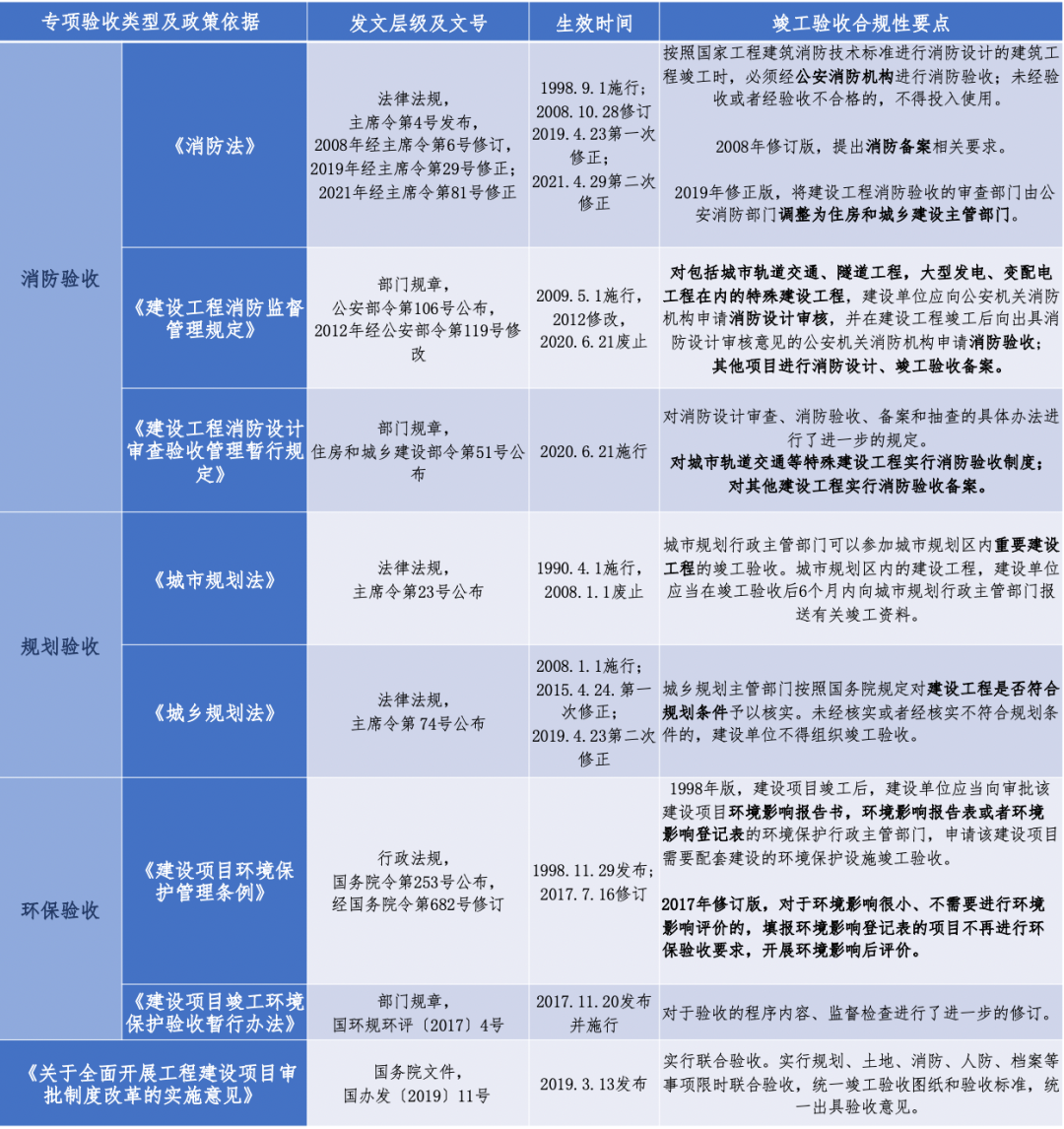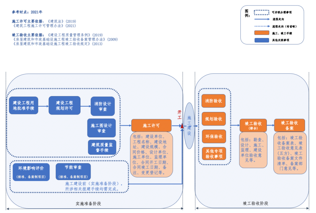 編者按 新中國成立以來,我國基礎(chǔ)設(shè)施投資建設(shè)取得了舉世矚目的成就,是國家經(jīng)濟(jì)社會發(fā)展的重要支撐,為人民生活水平的提高做出了巨大貢獻(xiàn)。改革開放以來,市場開始發(fā)揮配置資源的決定性作用,為我國基礎(chǔ)設(shè)施的發(fā)展煥發(fā)了新的活力。據(jù)統(tǒng)計(jì),我國基礎(chǔ)設(shè)施資產(chǎn)總規(guī)模在1990年排在全世界約第15位,2000年上升到第7位,2010年躍升為第3位,至2018年已居世界首位。 黨的二十大報(bào)告在回顧過去五年的工作和新時代十年的偉大變革中,充分肯定了基礎(chǔ)設(shè)施在經(jīng)濟(jì)社會中發(fā)揮的重要作用。報(bào)告指出,我國“建成世界最大的高速鐵路網(wǎng)、高速公路網(wǎng),機(jī)場港口、水利、能源、信息等基礎(chǔ)設(shè)施建設(shè)取得重大成就”。我國基礎(chǔ)設(shè)施多年來大規(guī)模的投資建設(shè)和存量資產(chǎn)的高速積累,是黨中央、國務(wù)院在建立社會主義市場經(jīng)濟(jì)體制背景下,關(guān)于投融資體制改革部署的重要成果。 項(xiàng)目前期工作手續(xù)的合規(guī)性要求,是基礎(chǔ)設(shè)施能夠發(fā)揮其應(yīng)有價值的重要前提,也是投融資體制改革關(guān)注的重點(diǎn)內(nèi)容之一。伴隨著政府職能轉(zhuǎn)變、深化“放管服”改革和擴(kuò)大有效投資等重大決策的關(guān)鍵部署,我國工程建設(shè)項(xiàng)目審批制度不斷優(yōu)化和改革,基礎(chǔ)設(shè)施項(xiàng)目投資前期決策管理經(jīng)歷了復(fù)雜的演變進(jìn)程,其合規(guī)性標(biāo)準(zhǔn)也在與時俱進(jìn)、不斷完善。當(dāng)前我國已進(jìn)入基礎(chǔ)設(shè)施存量時代,存量資產(chǎn)項(xiàng)目前期工作手續(xù)的合規(guī)性是重要的盤活條件之一,部分合規(guī)性問題已成為新時代社會廣泛關(guān)注的焦點(diǎn)。本項(xiàng)專題研究立足投融資體制和項(xiàng)目審批制度變革的歷史背景,嘗試?yán)迩寤A(chǔ)設(shè)施項(xiàng)目在立項(xiàng)、土地、規(guī)劃、環(huán)境、建設(shè)施工等方面主要前期工作的歷史變革脈絡(luò),梳理不同管理事項(xiàng)之間的邏輯關(guān)聯(lián),從這一視角提供基礎(chǔ)設(shè)施項(xiàng)目前期工作手續(xù)的合規(guī)性認(rèn)識。本公眾號將研究報(bào)告的部分成果以系列文章的形式陸續(xù)刊發(fā),研究報(bào)告第一部分為背景與立項(xiàng)篇,第二部分為土地與規(guī)劃篇,本文是系列研究報(bào)告的第三部分(建設(shè)施工篇),供業(yè)界同仁參考。 基礎(chǔ)設(shè)施項(xiàng)目前期工作手續(xù)合規(guī)性研究(Ⅲ) 張雪飛 伍迪 摘要:開工和竣工是基礎(chǔ)設(shè)施項(xiàng)目建設(shè)施工方面的重要工作節(jié)點(diǎn),依法合規(guī)開展有關(guān)工作是項(xiàng)目的合規(guī)性前提。建筑工程施工許可證(或開工報(bào)告)是建筑施工單位符合施工條件、允許開工的批準(zhǔn)文件,是建設(shè)單位進(jìn)行工程施工的法律憑證,是工程項(xiàng)目由實(shí)施準(zhǔn)備轉(zhuǎn)向施工建設(shè)、由藍(lán)圖設(shè)計(jì)變成項(xiàng)目實(shí)體的重要工作手續(xù)??⒐を?yàn)收是建設(shè)工程項(xiàng)目竣工后,全面考核建設(shè)工作、檢查是否符合設(shè)計(jì)要求和工程質(zhì)量的重要環(huán)節(jié),是工程項(xiàng)目由施工建設(shè)走向運(yùn)營投產(chǎn),是建設(shè)投資成果轉(zhuǎn)入交付使用的關(guān)鍵工作事項(xiàng)。本文聚焦基礎(chǔ)設(shè)施項(xiàng)目建設(shè)施工方面的手續(xù),尤其對施工許可和竣工驗(yàn)收兩方面的主要內(nèi)容和制度演進(jìn)進(jìn)行系統(tǒng)梳理,供業(yè)界參考。 關(guān)鍵詞:基礎(chǔ)設(shè)施;合規(guī)性;施工許可;竣工驗(yàn)收;政策演進(jìn) 一、施工許可手續(xù)合規(guī)性 (一)內(nèi)涵與適用范圍 建筑工程施工許可證是建筑施工單位符合施工條件、允許開工的批準(zhǔn)文件,是建設(shè)單位進(jìn)行工程施工的法律憑證。根據(jù)有關(guān)法律政策規(guī)定,在中華人民共和國境內(nèi)從事各類房屋建筑及其附屬設(shè)施的建造、裝修裝飾和與其配套的線路、管道、設(shè)備的安裝,以及城鎮(zhèn)市政基礎(chǔ)設(shè)施工程的施工,建設(shè)單位在開工前應(yīng)當(dāng)向工程所在地縣級以上人民政府建設(shè)行政主管部門申請領(lǐng)取施工許可證,國務(wù)院建設(shè)行政主管部門確定的限額以下的小型工程除外。具體而言,對于工程投資額在30萬元以下或者建筑面積在300平方米以下的建筑工程,可以不申請辦理施工許可證。各省、自治區(qū)、直轄市人民政府住房城鄉(xiāng)建設(shè)主管部門可以根據(jù)當(dāng)?shù)氐膶?shí)際情況,對限額進(jìn)行調(diào)整,并報(bào)國務(wù)院住房城鄉(xiāng)建設(shè)主管部門備案。按照國務(wù)院規(guī)定的權(quán)限和程序批準(zhǔn)開工報(bào)告的建筑工程,不再領(lǐng)取施工許可證。 辦理施工許可證有關(guān)事項(xiàng)應(yīng)主要以《中華人民共和國建筑法》(以下簡稱《建筑法》)和《建筑工程施工許可管理辦法》等法規(guī)政策為依據(jù)。根據(jù)最新修訂且現(xiàn)行有效的2019年版《建筑法》和2021年版《建筑工程施工許可管理辦法》,申請領(lǐng)取施工許可證,應(yīng)當(dāng)符合的條件