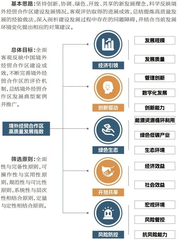 此次評(píng)價(jià)以“創(chuàng)新、協(xié)調(diào)、綠色、開放、共享”的新發(fā)展理念為基本原則,建立五大領(lǐng)域三級(jí)指標(biāo)的綜合評(píng)價(jià)指標(biāo)體系,對(duì)73個(gè)境外經(jīng)貿(mào)合作區(qū)在經(jīng)濟(jì)引領(lǐng)、創(chuàng)新驅(qū)動(dòng)、綠色生態(tài)、開放共享、風(fēng)險(xiǎn)防控等方面的高質(zhì)量發(fā)展?fàn)顩r進(jìn)行全面系統(tǒng)地分析評(píng)價(jià),結(jié)合新形勢(shì)新要求提出具體展望與相關(guān)建議,總結(jié)提煉合作區(qū)高質(zhì)量發(fā)展的經(jīng)驗(yàn)做法與典型案例,測(cè)算得出“境外經(jīng)貿(mào)合作區(qū)高質(zhì)量發(fā)展排名”,并最終形成《境外經(jīng)濟(jì)貿(mào)易合作區(qū)高質(zhì)量發(fā)展報(bào)告2023》。