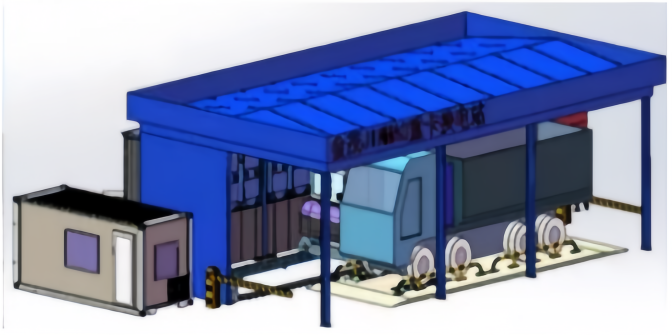 整體雙側(cè)換電占用空間較小,適用于電池存儲位置有限的礦卡車型,但由于整體雙側(cè)換電需要裝備兩套機(jī)器人及兩套電池存儲充電倉,其成本相對較高。整體雙側(cè)點(diǎn)換電如圖5所示。