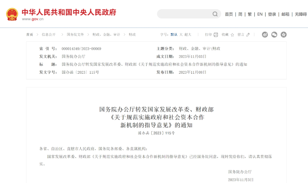 2023年11月8日,《國務(wù)院辦公廳轉(zhuǎn)發(fā)國家發(fā)展改革委、財政部<關(guān)于規(guī)范實施政府和社會資本合作新機(jī)制的指導(dǎo)意見>的通知》(國辦函〔2023〕115號,簡稱《PPP新機(jī)制》)正式對外公開,這是我國政府和社會資本合作(PPP)發(fā)展史的重要里程碑。《PPP新機(jī)制》建立了以鼓勵民間投資、發(fā)揮市場機(jī)制、遏制新增地方政府隱性債務(wù)為顯著特征的特許經(jīng)營新模式,重構(gòu)了特許經(jīng)營全周期管理的新流程,打通了新建、改擴(kuò)建項目與存量資產(chǎn)盤活的壁壘,標(biāo)志著PPP模式自2023年2月清理核查以來的再出發(fā),開啟高質(zhì)量發(fā)展的新征程。