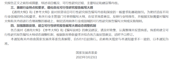 投資項(xiàng)目可行性研究 邁入高質(zhì)量論證新階段 ——解析《投資項(xiàng)目可行性研究報(bào)告編寫大綱》 中國(guó)國(guó)際工程咨詢有限公司 李開(kāi)孟 徐成彬 高質(zhì)量發(fā)展是中國(guó)式現(xiàn)代化的本質(zhì)要求。高質(zhì)量發(fā)展需要高質(zhì)量的投資,高質(zhì)量的投資需要高質(zhì)量的投資決策,高質(zhì)量的可行性研究是確保投資科學(xué)決策的重要基礎(chǔ)。近日,國(guó)家發(fā)展改革委出臺(tái)《關(guān)于印發(fā)投資項(xiàng)目可行性研究報(bào)告編寫大綱及說(shuō)明的通知》(發(fā)改投資規(guī)〔2023〕304號(hào),點(diǎn)擊閱讀原文),正式發(fā)布《政府投資項(xiàng)目可行性研究報(bào)告編寫通用大綱(2023版)》和《企業(yè)投資項(xiàng)目可行性研究報(bào)告編寫參考大綱(2023版)》(簡(jiǎn)稱《可研大綱》) ,這是繼《投資項(xiàng)目可行性研究指南(試用版)》(簡(jiǎn)稱《可研指南》),時(shí)隔二十年之后國(guó)家投資主管部門發(fā)布的關(guān)于規(guī)范投資項(xiàng)目可行性研究報(bào)告編寫工作的新的綱領(lǐng)性文件,對(duì)于我國(guó)新時(shí)代投資項(xiàng)目科學(xué)決策、推動(dòng)實(shí)現(xiàn)高質(zhì)量投資具有里程碑意義,標(biāo)志著我國(guó)投資項(xiàng)目可行性研究工作將邁入高質(zhì)量論證的新階段。 一、《可研大綱》是投資項(xiàng)目可行性論證的重大飛躍 1.可行性研究伴隨改革開(kāi)放納入了決策程序并逐步走向規(guī)范 可行性研究作為投資項(xiàng)目科學(xué)決策的一種專業(yè)工具,在世界銀行和聯(lián)合國(guó)工業(yè)發(fā)展組織等國(guó)際機(jī)構(gòu)的推動(dòng)下,20世紀(jì)80年代初隨著改革開(kāi)放傳入我國(guó),并成為項(xiàng)目投資決策的必經(jīng)程序。2002年1月,國(guó)家發(fā)展計(jì)劃委員會(huì)發(fā)布《關(guān)于出版〈投資項(xiàng)目可行性研究指南(試用版)〉的通知》(計(jì)辦投資〔2002〕15號(hào)),同意出版發(fā)行《可研指南》?!犊裳兄改稀废到y(tǒng)總結(jié)了我國(guó)改革開(kāi)放第一個(gè)20年可行性研究工作的經(jīng)驗(yàn)教訓(xùn),成為我國(guó)第一個(gè)在國(guó)家層次上用以指導(dǎo)投資項(xiàng)目可行性研究工作的規(guī)范性文本,標(biāo)志著投資項(xiàng)目可行性研究進(jìn)入規(guī)范化管理階段。 2.《可研大綱》融入了《可研指南》試用經(jīng)驗(yàn)并創(chuàng)新發(fā)展 中國(guó)國(guó)際工程咨詢公司(簡(jiǎn)稱中咨公司)受原國(guó)家計(jì)委委托研究制定的《可研指南》,發(fā)布試用至今已有21年。20多年來(lái),我國(guó)投融資體制和項(xiàng)目管理制度發(fā)生了深刻變化?!犊裳写缶V》的研究起草工作,系統(tǒng)總結(jié)了《可研指南》試用20年積累的經(jīng)驗(yàn),適應(yīng)了投融資體制改革和行政審批制度改革等要求,并立足新發(fā)展階段,采用開(kāi)放研究方式,不斷創(chuàng)新發(fā)展。研究起草期間,國(guó)家發(fā)展改革委投資司多次召開(kāi)座談會(huì)和研討會(huì),廣泛征求中央部委、中央企業(yè)、地方政府、金融機(jī)構(gòu)、咨詢?cè)u(píng)估機(jī)構(gòu)等單位的意見(jiàn),并于2022年11月29日在國(guó)家發(fā)展改革委的官網(wǎng)向社會(huì)公開(kāi)征求意見(jiàn),受到了國(guó)內(nèi)外廣泛關(guān)注,先后收到了有關(guān)單位正式提交的1000多條修改完善建議,通過(guò)專家集體討論和逐條消化吸收,遂成終稿。因此,《可研大綱》是集思廣益、群策群力的結(jié)果,是集體智慧的結(jié)晶。 圖1 2023年1月5日,國(guó)家發(fā)展改革委投資司主持召開(kāi)《可研大綱》專家座談會(huì) 3.《可研大綱》是引領(lǐng)投資項(xiàng)目高質(zhì)量決策的重要遵循 高質(zhì)量發(fā)展是我國(guó)新時(shí)代經(jīng)濟(jì)社會(huì)轉(zhuǎn)型發(fā)展的基本要求,同時(shí)也是我國(guó)投資項(xiàng)目可行性研究工作的核心價(jià)值導(dǎo)向。國(guó)家發(fā)展改革委本次正式印發(fā)的《可研大綱》,包括《政府投資項(xiàng)目可行性研究報(bào)告編制通用大綱(2023年版)》(簡(jiǎn)稱《通用大綱》)和《企業(yè)投資項(xiàng)目可行性研究報(bào)告編制參考大綱(2023年版)》(簡(jiǎn)稱《參考大綱》,不僅體現(xiàn)了最近20年投融資體制深化改革的重要成果,也體現(xiàn)了新時(shí)代高質(zhì)量發(fā)展的理念要求,其推廣應(yīng)用將有利于全面提升我國(guó)投資項(xiàng)目可行性研究的整體水平,有利于發(fā)揮可行性研究對(duì)項(xiàng)目投資科學(xué)決策的關(guān)鍵支撐作用,在擴(kuò)大有效投資、推動(dòng)投資項(xiàng)目高質(zhì)量發(fā)展的實(shí)際工作中發(fā)揮引領(lǐng)作用。 二、《可研大綱》構(gòu)建了統(tǒng)一的可行性研究邏輯框架體系 (一)《可研大綱》要求可行性研究應(yīng)遵循“三大目標(biāo)、七個(gè)維度”總體框架 《可研大綱》將境內(nèi)各行各業(yè)千差萬(wàn)別的可行性研究?jī)?nèi)容進(jìn)行歸納提煉,提出了以“三大目標(biāo)、七個(gè)維度”為核心的可行性研究邏輯框架體系,即投資項(xiàng)目可行性研究應(yīng)圍繞建設(shè)必要性、方案可行性及風(fēng)險(xiǎn)可控性三大目標(biāo)開(kāi)展系統(tǒng)、專業(yè)、深入論證,重點(diǎn)把握“