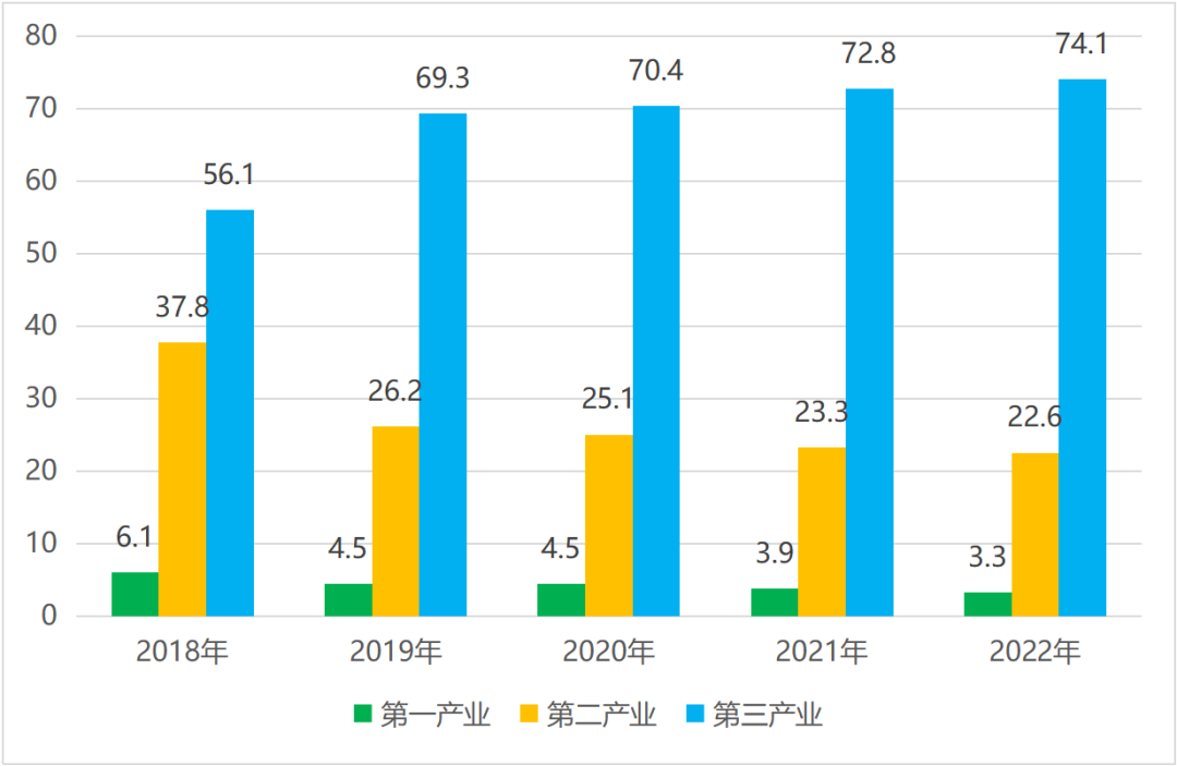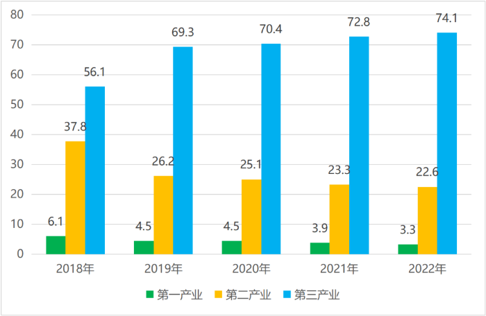 數(shù)據(jù)來源:2018年-2021年平谷區(qū)統(tǒng)計年鑒,2022年平谷區(qū)國民經(jīng)濟(jì)和社會發(fā)展統(tǒng)計公報。圖1 2018年-2022年平谷區(qū)三產(chǎn)占地區(qū)生產(chǎn)總值比重情況
