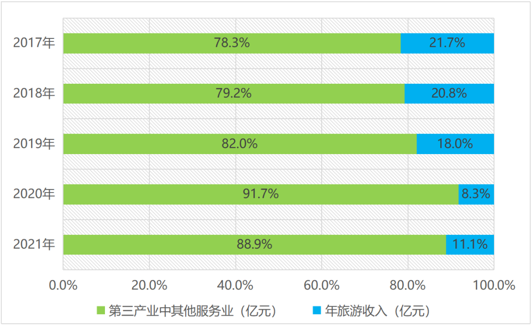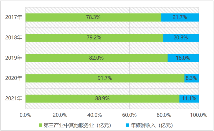 數(shù)據(jù)來源:2018年-2022年平谷區(qū)統(tǒng)計年鑒,2022年北京文化和旅游統(tǒng)計概覽。圖2 2017年-2021年平谷區(qū)旅游收入及其他服務(wù)業(yè)占第三產(chǎn)業(yè)產(chǎn)值比重情況