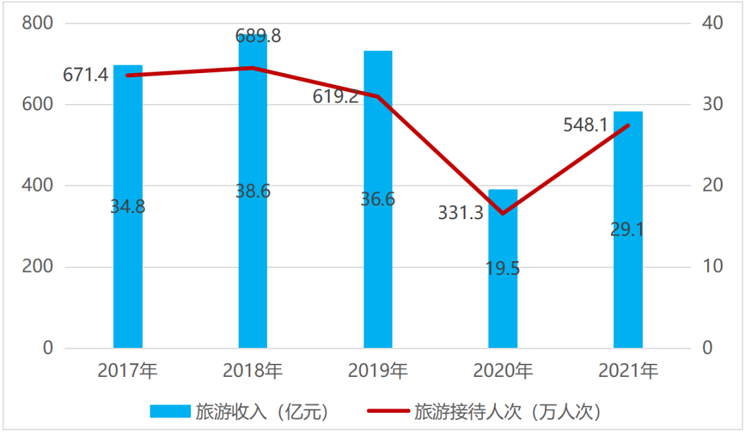 疫情前三年(2017年-2019年),平谷區(qū)年均旅游收入為36.7億元,年均接待人次為660萬人次。2018年旅游業(yè)發(fā)展最好,旅游收入38.6億元,同比增長10.9%,接待人次689.8萬人次,同比增長2.7%。2019年因創(chuàng)建國家全域旅游示范區(qū),關(guān)停部分旅游相關(guān)配套與服務(wù)設(shè)施,旅游經(jīng)濟(jì)整體出現(xiàn)小幅回落情況。2020年為疫情暴發(fā)第一年,受行業(yè)大環(huán)境影響,旅游收入與接待人次出現(xiàn)大幅下浮,2021年開始回升,旅游收入和接待人次分別恢復(fù)至2019年的79.5%和88.5%,恢復(fù)速度優(yōu)于北京市平均水平。