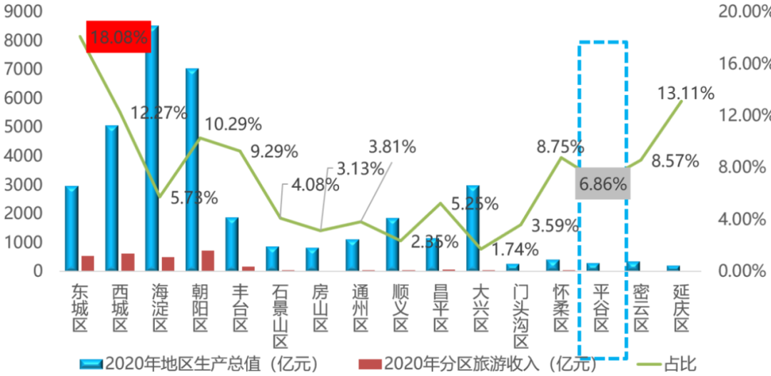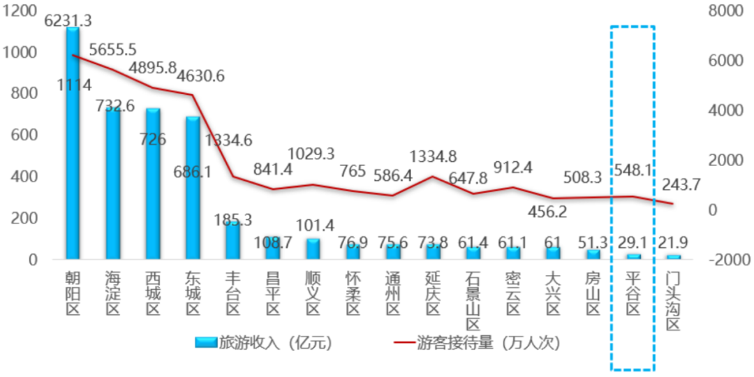 數(shù)據(jù)來源:2020年北京市分區(qū)旅游數(shù)據(jù)統(tǒng)計報告、2021年北京市統(tǒng)計年鑒。