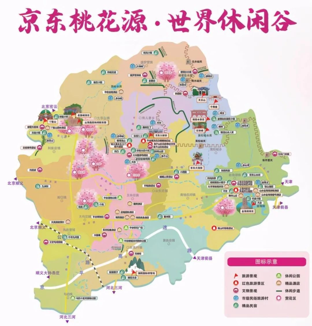 平谷區(qū)是中國著名的大桃之鄉(xiāng),大桃種植面積22萬畝、年產(chǎn)近2億公斤,被譽(yù)為“世界最大的桃園、中國最大的桃鄉(xiāng)、首都最大的果區(qū)”。大桃產(chǎn)業(yè)是平谷區(qū)的特色產(chǎn)業(yè)、富民產(chǎn)業(yè)、綠色產(chǎn)業(yè)和生態(tài)產(chǎn)業(yè),具備良好的經(jīng)濟(jì)、生態(tài)和社會效益。桃花成為平谷區(qū)花,“桃花節(jié)”成為平谷固定節(jié)日,已經(jīng)成功連續(xù)舉辦13屆,成為京津冀地區(qū)炙手可熱的春季旅游活動。2019年平谷區(qū)榮獲首批“國家全域旅游示范區(qū)”,通過創(chuàng)建活動,無障礙環(huán)境建設(shè)、精品民宿工程、旅游交通道路工程等一批重點(diǎn)項(xiàng)目得以落地實(shí)施,極大地改善了全域旅游環(huán)境,游客量激增。2020年世界休閑大會又在平谷成功舉辦,吸引國際國內(nèi)眾多游客往來平谷,極大程度上提升了平谷旅游的市場認(rèn)知度和知名度。