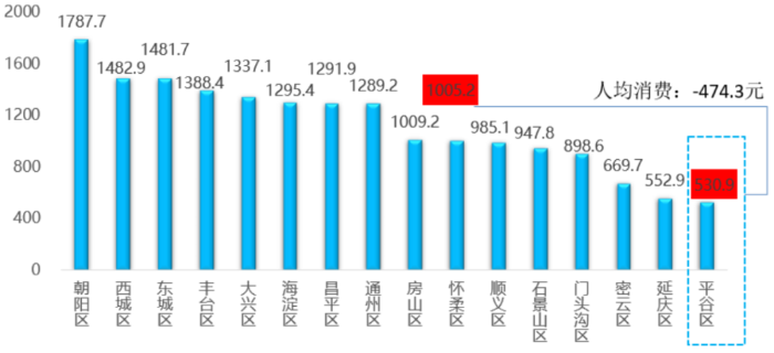 2021年,平谷區(qū)游客人均花費(fèi)530.9元,排名全市倒數(shù)第一。與生態(tài)涵養(yǎng)區(qū)中人均花費(fèi)水平最高的懷柔區(qū)相比,相差474.3元,僅達(dá)到懷柔區(qū)的52.9%。此外,平谷區(qū)游客人均花費(fèi)也低于全國平均水平,相差368.4元。