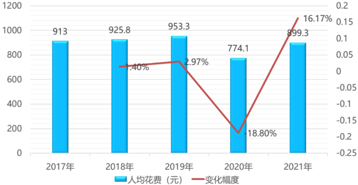 數(shù)據(jù)來源:中國旅游行業(yè)發(fā)展趨勢調(diào)研與投資前景分析報告(2022年-2029年)。圖8 2017年-2021年全國游客人均花費(fèi)情況
