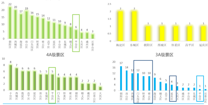 盡管平谷區(qū)擁有良好的生態(tài)、品牌等資源且占據(jù)京津冀地區(qū)重要客源市場,但在搭建有效旅游產(chǎn)品供應(yīng)體系方面存在很多不足,有很大改善空間。從游客認(rèn)知角度來看,平谷區(qū)沒有5A級旅游景區(qū),且除金海湖外,缺乏更多大景區(qū)IP作為重要游客引流地。對比同為生態(tài)涵養(yǎng)區(qū)的其他區(qū),延慶區(qū)有八達(dá)嶺、龍慶峽,密云區(qū)有古北水鎮(zhèn)、黑龍?zhí)?,懷柔區(qū)有雁棲湖、不夜谷、紅螺寺等,都是游客市場出游率和重游率很高的知名目的地。平谷區(qū)雖然擁有5家4A級旅游景區(qū),但基本為山岳型旅游景區(qū),景區(qū)資源方面高度同質(zhì)化,景區(qū)單打獨(dú)斗缺乏合力。3A級旅游景區(qū)僅有1家,生態(tài)涵養(yǎng)區(qū)中排名末位,難以為游客提供多元化的旅游需求。