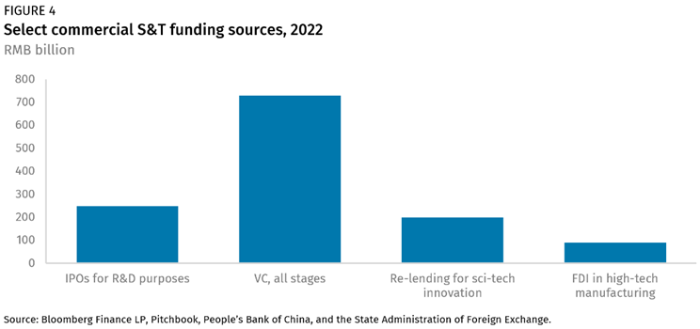 最后,中國(guó)經(jīng)濟(jì)增長(zhǎng)承壓也會(huì)影響構(gòu)成中國(guó)企業(yè)研發(fā)資金另外約45%的商業(yè)來(lái)源。大多數(shù)商業(yè)資金來(lái)自企業(yè)利潤(rùn)再投資。但對(duì)于收支不平衡的企業(yè)來(lái)說(shuō),風(fēng)險(xiǎn)投資(VC)和私募股權(quán)投資(PE)也是重要的資金來(lái)源。最后,企業(yè)通常通過(guò)首次公開(kāi)募股融資、優(yōu)惠貸款或商業(yè)貸款籌集研發(fā)資金,在中國(guó)的銀行體系中,創(chuàng)新型企業(yè)可以廣泛獲得這些資金(圖 4)。