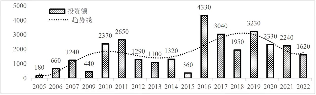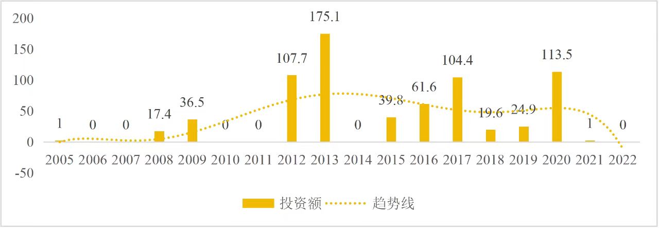 企業(yè)境外投資研究之二: 中央企業(yè)境外投資情況 楊凱越 編者按:根據(jù)商務(wù)部2023年10月發(fā)布的我國(guó)對(duì)外直接投資統(tǒng)計(jì)數(shù)據(jù),截至2022年,我國(guó)對(duì)外直接投資存量達(dá)27548.1億美元,當(dāng)年對(duì)外直接投資規(guī)模達(dá)1631.2億美元,居世界第二位。截至2022年底,中國(guó)2.9萬(wàn)家境內(nèi)投資者共設(shè)立境外企業(yè)4.66萬(wàn)家,分布在全球190個(gè)國(guó)家(地區(qū)),年末境外企業(yè)資產(chǎn)總額8.4萬(wàn)億美元。隨著“雙循環(huán)”戰(zhàn)略、“走出去”戰(zhàn)略和“一帶一路”倡議的深入推進(jìn)實(shí)施,對(duì)企業(yè)境外投資開(kāi)展系統(tǒng)研究,探索如何更高質(zhì)量地開(kāi)展境外投資,成為當(dāng)前一項(xiàng)重要和緊迫的任務(wù)。本公眾號(hào)將企業(yè)境外投資研究成果以系列文章的形式陸續(xù)刊發(fā),本文是研究報(bào)告的第二部分,供業(yè)界同仁參考。 一、總體情況 中央企業(yè)2013-2019年境外投資年均增速約15%,營(yíng)業(yè)收入增速保持在約4.5%。根據(jù)國(guó)務(wù)院國(guó)資委和社科院聯(lián)合發(fā)布的《中央企業(yè)海外社會(huì)責(zé)任藍(lán)皮書(shū)(2020)》,中央企業(yè)在境外投資發(fā)展時(shí),7%投資第一產(chǎn)業(yè),69%參與第二產(chǎn)業(yè),40%發(fā)展第三產(chǎn)業(yè)。截至2019年底,中央企業(yè)境外資產(chǎn)總額8.1萬(wàn)億元、所有者權(quán)益2.3萬(wàn)億元。其中,81家中央企業(yè)在“一帶一路”沿線承擔(dān)項(xiàng)目數(shù)量逾3400個(gè)。中央企業(yè)承擔(dān)“一帶一路”基礎(chǔ)設(shè)施項(xiàng)目數(shù)比率超過(guò)60%,合同投資額超過(guò)80%。 近年來(lái),中央企業(yè)境外投資及運(yùn)營(yíng)總體仍呈現(xiàn)較為平穩(wěn)的態(tài)勢(shì)。中央企業(yè)2013-2020年境外營(yíng)業(yè)收入總規(guī)模逾24萬(wàn)億元,利潤(rùn)總規(guī)模約6000億元。2021年,中央企業(yè)和單位對(duì)外非金融類(lèi)直接投資642.9億美元,占我國(guó)對(duì)外直接投資比重約36.0%,同比增長(zhǎng)30.7%,逾60%來(lái)自收益再投資。根據(jù)國(guó)務(wù)院國(guó)資委《中央企業(yè)海外發(fā)展報(bào)告(2023)》,截至2022年底,中央企業(yè)境外投資機(jī)構(gòu)和項(xiàng)目逾8000個(gè),境外員工125萬(wàn)人,境外資產(chǎn)總額近8萬(wàn)億元(比2019年略有下降),當(dāng)年境外投資規(guī)模3739億元。 表1 中央企業(yè)境外投資規(guī)模 單位:億美元 數(shù)據(jù)來(lái)源:商務(wù)部2016-2021年度中國(guó)對(duì)外直接投資統(tǒng)計(jì)公報(bào)。 本文根據(jù)中國(guó)全球投資追蹤(China Global Investment Tracker,CGIT)數(shù)據(jù)庫(kù),按照國(guó)務(wù)院國(guó)資委2023年中央企業(yè)名錄,對(duì)我國(guó)中央企業(yè)境外投資情況進(jìn)行了整理。因數(shù)據(jù)口徑不同,中央企業(yè)境外投資規(guī)模與前述商務(wù)部統(tǒng)計(jì)數(shù)據(jù)有所差異。根據(jù)CGIT數(shù)據(jù),中央企業(yè)境外投資在2013年達(dá)到峰值858.7億美元,此后呈下降趨勢(shì),2022年境外投資規(guī)模僅180.3億美元。 數(shù)據(jù)來(lái)源:CGIT數(shù)據(jù)庫(kù),作者整理。 圖1 2005-2022年中央企業(yè)境外投資規(guī)模 單位:億美元 根據(jù)CGIT數(shù)據(jù)庫(kù),中央企業(yè)2005-2022年各行業(yè)境外投資情況見(jiàn)圖2。其中,能源類(lèi)境外投資規(guī)模最高,為4460.1億美元;建筑工程類(lèi)(包括鐵路、公路等交通基礎(chǔ)設(shè)施建設(shè)類(lèi))境外投資規(guī)模其次,為1534億美元;金屬類(lèi)(含礦產(chǎn))境外投資排名第三為972.5億美元;公用事業(yè)類(lèi)境外投資規(guī)模第四,為702.5億美元;此外,中央企業(yè)境外投資涉及領(lǐng)域還包括旅游、健康、金融、科技、農(nóng)業(yè)、化工、物流、娛樂(lè)等。2018-2022年各行業(yè)境外投資情況見(jiàn)圖3。 數(shù)據(jù)來(lái)源:CGIT數(shù)據(jù)庫(kù),作者整理。 圖2 2005-2022年中央企業(yè)分行業(yè)境外投資規(guī)模 單位:億美元 數(shù)據(jù)來(lái)源:CGIT數(shù)據(jù)庫(kù),作者整理。 圖3 2018-2022年中央企業(yè)分行業(yè)境外投資規(guī)模 單位:百萬(wàn)美元 二、分行業(yè)情況 本文對(duì)2005年1月-2022年12月我國(guó)中央企業(yè)境外投資選取能源行業(yè)、建筑工程行業(yè)、金屬行業(yè)、公用事業(yè)、旅游業(yè)等投資規(guī)模位居前列的行業(yè),分行業(yè)情況進(jìn)行了整理。 (一)能源行業(yè) 2005-2022年中央企業(yè)能源行業(yè)境外投資情況見(jiàn)圖4。分析發(fā)現(xiàn),我國(guó)中央企業(yè)能源行業(yè)境外投資在2010年達(dá)到峰值后呈逐年下降的趨勢(shì)。 數(shù)據(jù)來(lái)源:CGIT數(shù)據(jù)庫(kù),作者整理。 圖4 能源行業(yè)2005-2022年中央企業(yè)境外投資規(guī)模 單位:億美元 (二)建筑工程行業(yè) 2005-2022年中央企業(yè)建筑工程行業(yè)境外投資情況見(jiàn)圖5。分析發(fā)現(xiàn),建筑工程行業(yè)境外投資在2009年達(dá)到峰值,此后呈逐年下降。 數(shù)據(jù)來(lái)源:CGIT數(shù)據(jù)庫(kù),作者整理。 圖5 建筑工程行業(yè)2005-2022年中央企業(yè)境外投資規(guī)模 單位:億美元 (三)金屬行業(yè) 2005-2022年中央企業(yè)金屬行業(yè)境外投資情況見(jiàn)圖6