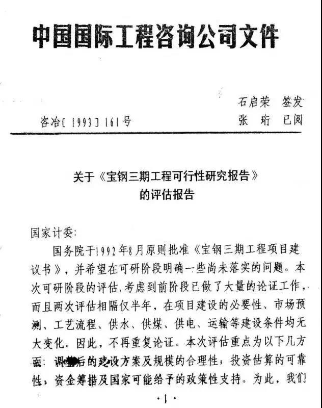 編者按:《共和國的鋼鐵歲月》一書通過對中國國際工程咨詢公司原黨組書記、總經(jīng)理石啟榮同志的訪談,揭示了我國鋼鐵工業(yè)發(fā)展過程中一些鮮為人知的故事,再現(xiàn)了鋼鐵工業(yè)艱苦卓絕、波瀾壯闊的發(fā)展歷程,為鋼鐵工業(yè)的歷史傳承和轉(zhuǎn)型升級注入了新的正能量。本書20余萬字,由在石啟榮身邊工作的同志們歷經(jīng)十多年收集整理而成,圖文并茂,內(nèi)容翔實(shí),對了解共和國火紅的鋼鐵年代具有很高的史料價值,對鋼鐵工業(yè)未來發(fā)展也具有現(xiàn)實(shí)意義。 本文全文摘錄自該書第一部分。 寶鋼集團(tuán)有限公司(以下簡稱“寶鋼”)是中國改革開放的產(chǎn)物,1978年12月23日,黨的十一屆三中全會閉幕的第二天,在上海北翼長江之畔的寶山區(qū)打下第一根樁。經(jīng)過39年的發(fā)展,寶鋼已成為中國現(xiàn)代化程度最高、最具競爭力的大型鋼鐵聯(lián)合企業(yè)。 2016年,寶鋼連續(xù)十三年進(jìn)入美國《財富》雜志評選的世界500強(qiáng)榜單,列第275位,在世界鋼鐵企業(yè)排序中列第5位。寶鋼的建設(shè),極大地促進(jìn)了中國鋼鐵工業(yè)的技術(shù)進(jìn)步,實(shí)現(xiàn)了中國鋼鐵工業(yè)的跨越式發(fā)展,從此,我國鋼鐵業(yè)開始躋身世界先進(jìn)行列。 寶鋼工程是國家的一個重大建設(shè)項(xiàng)目,當(dāng)初建設(shè)這樣的大鋼廠,必須把全社會的力量組織起來,舉全國之力來實(shí)施。 寶鋼打下第一根樁 1978年12月-1985年9月,第一座高爐及相應(yīng)的煉鋼、公輔設(shè)施投入生產(chǎn),人們習(xí)慣稱之為寶鋼“一期”工程。 1985年10月-1992年7月,第二座高爐及煉鋼、軋鋼工程相繼投入生產(chǎn),人們稱之為寶鋼“二期”工程。需要說明的是,寶鋼與日本簽訂的合同中并無一期、二期之分。 20世紀(jì)90年代,第三座高爐、1580mm熱連軋機(jī)、1550mm/1420mm冷連軋機(jī)、相應(yīng)的公輔設(shè)施投入生產(chǎn),人們稱之為寶鋼 “三期”工程。 進(jìn)入21世紀(jì),寶鋼又建設(shè)了1850mm熱連軋及1800mm冷連軋汽車板生產(chǎn)線、4號高爐、5m寬厚板軋機(jī)以及廣東湛江鋼鐵基地等。 在寶鋼39年發(fā)展的風(fēng)風(fēng)雨雨中,石啟榮同志矢志不渝地支持寶鋼,他一直謀劃和指導(dǎo)寶鋼的現(xiàn)代化建設(shè),為寶鋼的發(fā)展壯大作出了貢獻(xiàn)。 1980年5月,石啟榮同志擔(dān)任國家建委重工業(yè)局副局長。 1982年,國家建委撤銷,一分為三,其國土資源局并入國家計(jì)委,建設(shè)局、標(biāo)準(zhǔn)定額局、設(shè)計(jì)局、標(biāo)準(zhǔn)研究所并入建設(shè)部,能源局、交通局、重工業(yè)局和綜合局成立基建辦公室并入國家經(jīng)濟(jì)委員會,石啟榮任辦公室副主任。1982年5月,國務(wù)院代表韓光主持“寶鋼建設(shè)現(xiàn)場辦公會議”,石啟榮同志協(xié)助國務(wù)院代表,全面負(fù)責(zé)寶鋼對外、對內(nèi)各項(xiàng)事務(wù)。寶鋼一期共召開8次國務(wù)院代表會議、二期共召開10次國務(wù)院代表會議。 1983年,基建辦公室撤銷,石啟榮任國家經(jīng)委委員。 1984年年初,原基建辦公室的全部建制并入國家計(jì)委,石啟榮任國家計(jì)委委員。當(dāng)時為推動寶鋼建設(shè),國家經(jīng)委、計(jì)委成立了“計(jì)委、經(jīng)委寶鋼建設(shè)聯(lián)合辦公室”,石啟榮同志任辦公室主任,兩委重工業(yè)局的領(lǐng)導(dǎo)任副主任,解決寶鋼工程建設(shè)中涉及計(jì)委、經(jīng)委相關(guān)事宜。 1985年10月后,石啟榮同志任國家計(jì)委委員、專職委員、黨組成員,同時兼任中國國際工程咨詢公司黨組書記、總經(jīng)理(副部長級)。 1994年1月以后,石啟榮同志擔(dān)任國家發(fā)展改革委顧問。 1996年1月,石啟榮同志卸任中國國際工程咨詢公司總經(jīng)理后擔(dān)任專家委員會主任,繼續(xù)為寶鋼的后續(xù)建設(shè)發(fā)展出謀劃策。 寶鋼每一個重大建設(shè)項(xiàng)目,石啟榮都親自帶隊(duì)實(shí)地考察、策劃、評估,遇到問題不遺余力地協(xié)調(diào)解決,時刻關(guān)心著寶鋼的健康成長。 本篇以時間為脈絡(luò),摘取石啟榮同志在寶鋼各期建設(shè)過程中做出的幾件有代表性事件,以點(diǎn)映面,以饗讀者。 01 改革開放,寶鋼揚(yáng)帆正當(dāng)時 1976年年底,十年“文革”浩劫剛剛結(jié)束,百廢待興,國家經(jīng)濟(jì)十分困難,各行各業(yè)亟須重整旗鼓,上下都憋足了勁,要把失去的十年補(bǔ)回來,我國由此進(jìn)入新的歷史發(fā)展時期,社會主義現(xiàn)代化建設(shè)被重新提到最重要的議程上。 當(dāng)時全國鋼產(chǎn)量僅有2100萬t,生產(chǎn)技術(shù)落后,無法滿足社會主義現(xiàn)代化建設(shè)的需要,技術(shù)含量高、附加值高的鋼材基本全部依賴進(jìn)口。 石啟榮同志的匯報手稿(摘選) 1977年1月,上海市和冶金工業(yè)部提出,為了解決長期以來我國鋼材供需矛盾,趕上世界先進(jìn)冶金技術(shù)水平,促進(jìn)全國鋼鐵工業(yè)現(xiàn)代化的發(fā)展,國家亟須建設(shè)一個現(xiàn)代化的大型鋼鐵企業(yè)。 20世紀(jì)70年代初期,中日兩國正式建交,日本經(jīng)濟(jì)經(jīng)過20多年的高速發(fā)展,工業(yè)技術(shù)已經(jīng)處于全球領(lǐng)先地位,也積累了大量的外匯,而中國擁有廣闊的市場空間,雙方加強(qiáng)合作可以實(shí)現(xi